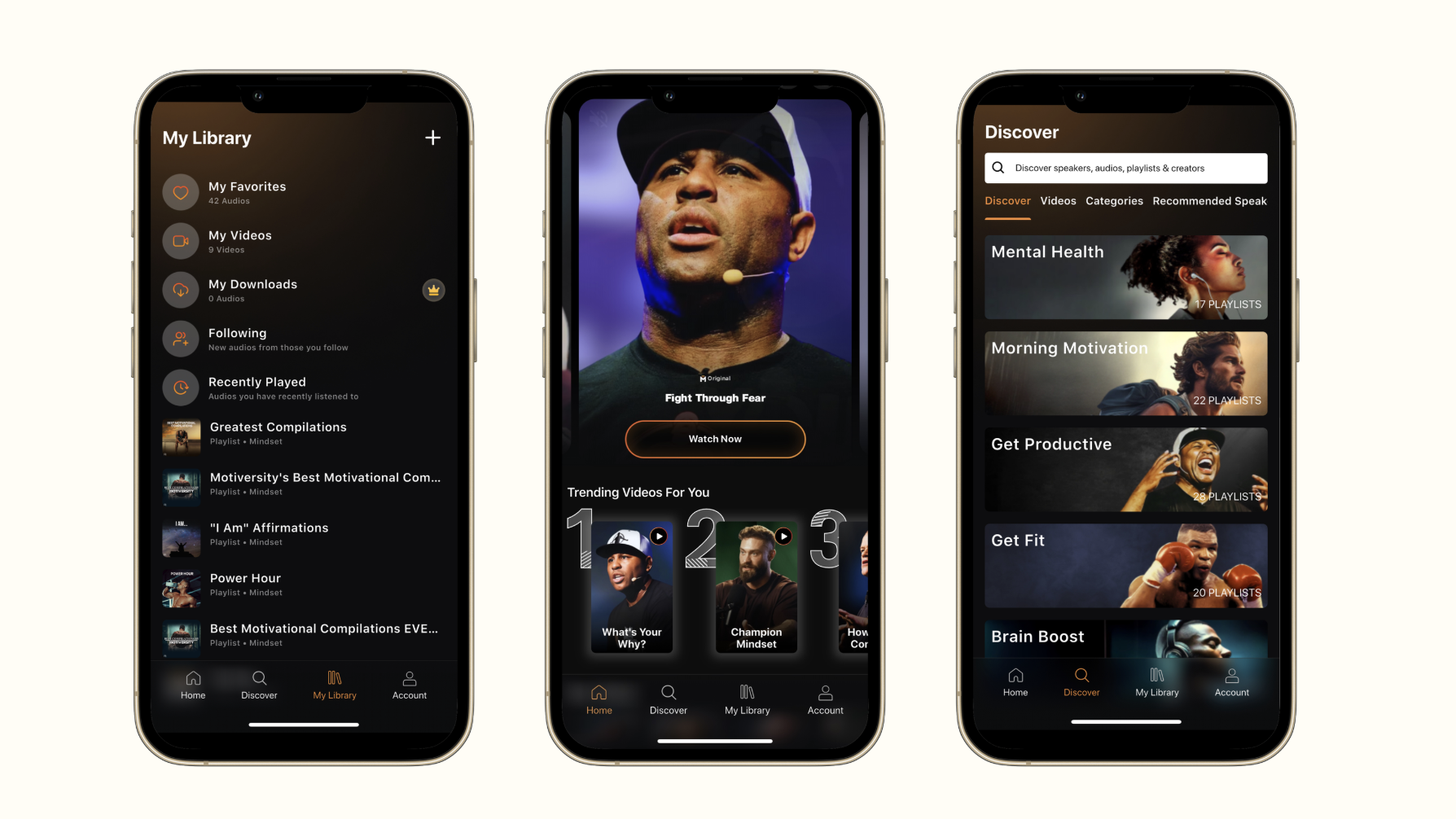 Mobile application platform for motivation and self-development with inspirational audio and video content for personal growth.